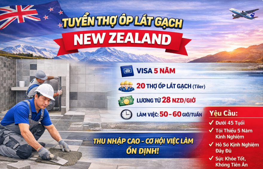 Hiện nay, đối tác của chúng tôi tại New Zealand đang tuyển 20 thợ ốp lát gạch (Tiler) làm việc lâu dài với visa 5 năm, mức lương từ 28 NZD/giờ và thời gian làm việc ổn định 50 – 60 giờ/tuần. Đây là cơ hội tốt để người lao động trong ngành xây dựng nâng cao thu nhập, tích lũy kinh nghiệm làm việc quốc tế và xây dựng nền tảng nghề nghiệp bền vững trong tương lai.